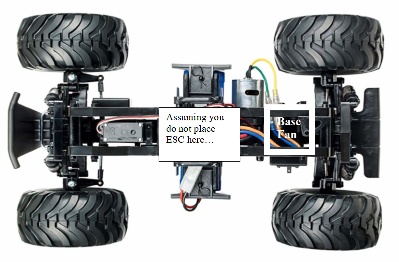 You can putĀ  3cm fan on it and have it secured with hot glue. Due to the heavy load to be sustained by the ESC (two motors), a slightly larger fan is recommended.