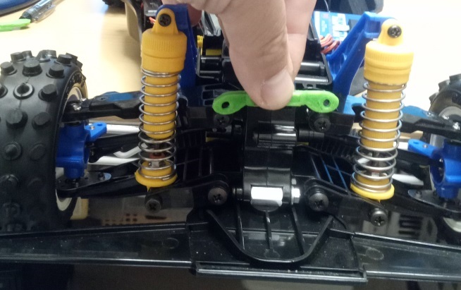 This is a reinforcement brace for the Tamiya Boomerang. You use it at the front where the upper arms are mounted. This is particularly useful for protection when either side of the front takes a hit.