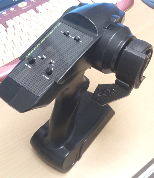 This is a snap-in transmitter steering extension handle, allowing you to use only your left hand to control the car. Supports steering wheel with a diameter of 48mm or less.