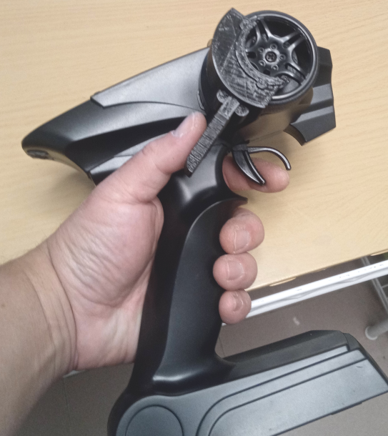 This is a snap-in transmitter steering extension handle, allowing you to use only your left hand to control the car. Supports steering wheel with a diameter of 48mm or less.