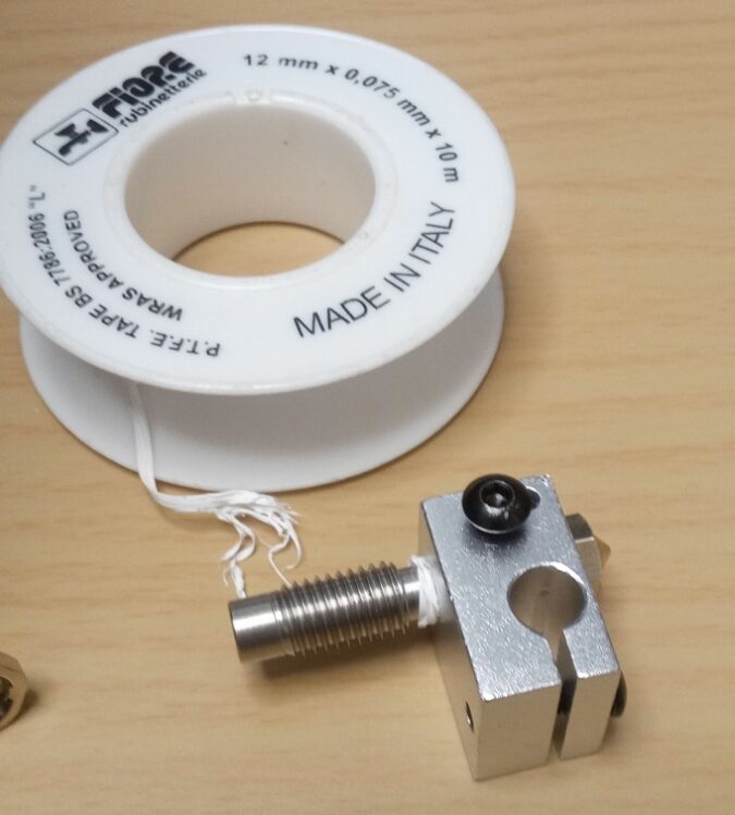 If the heat block assembly or the nozzle is loose, one quick and easy way to help tightening things up is to use water seal tape. It works surprisingly well even under high temperature.