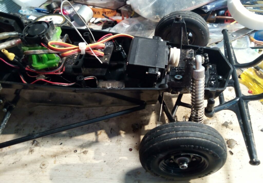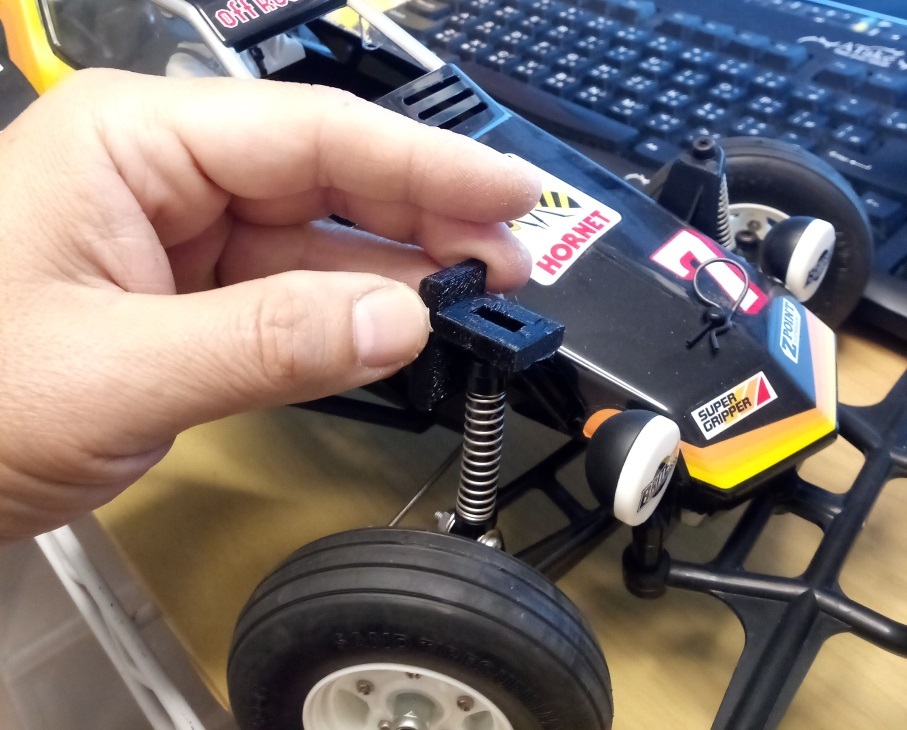 Front damper mount for Tamiya Grasshopper/Hornet. This mount allows the use of larger but shot dampers on these cars. It has a screw hole so you can use a set of screw and nut to attach it to the original damper mount.