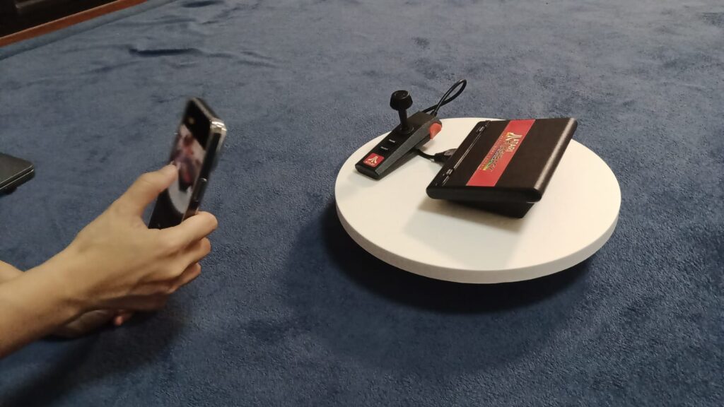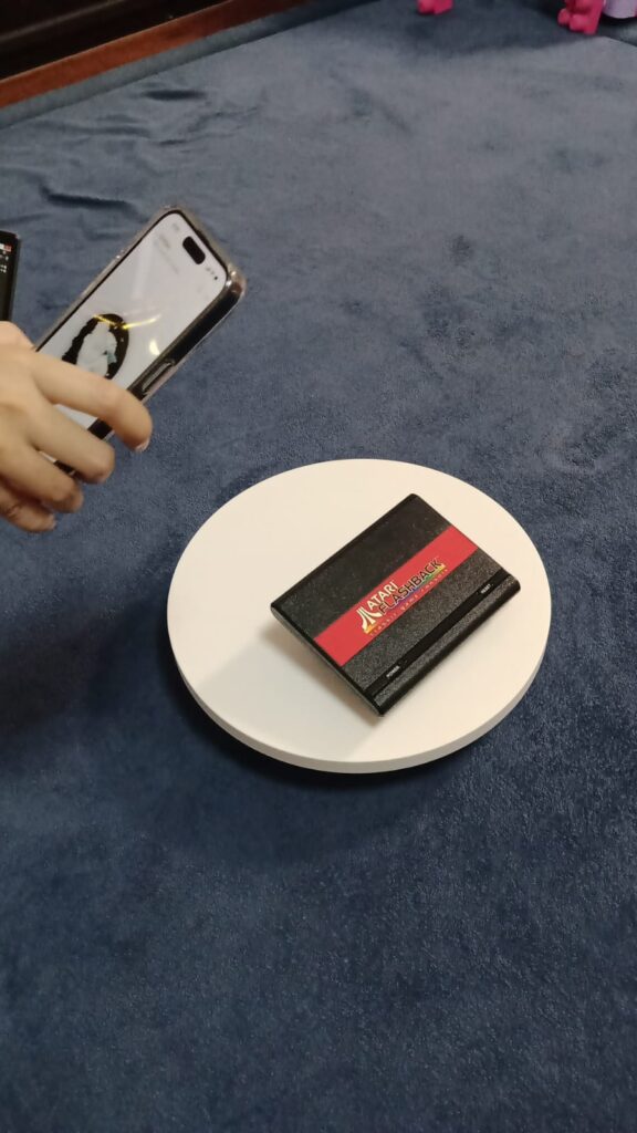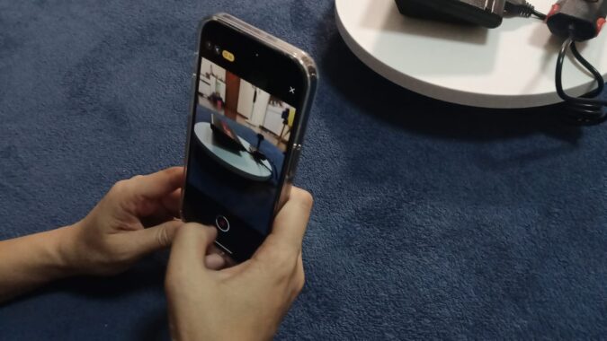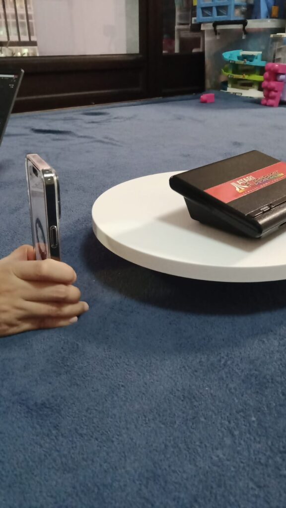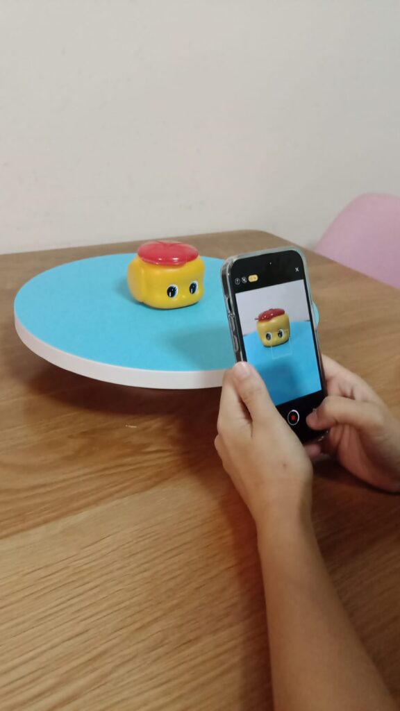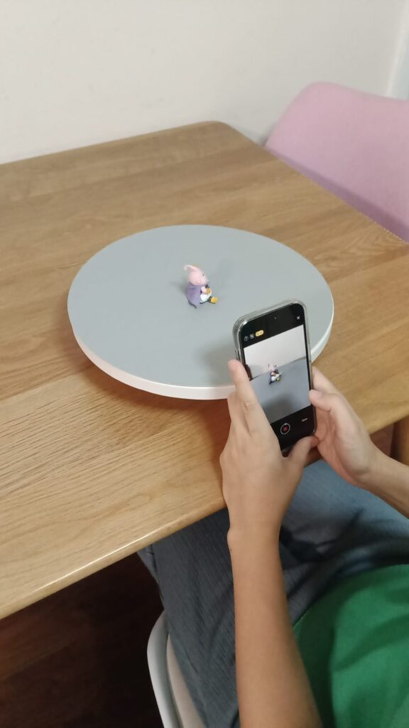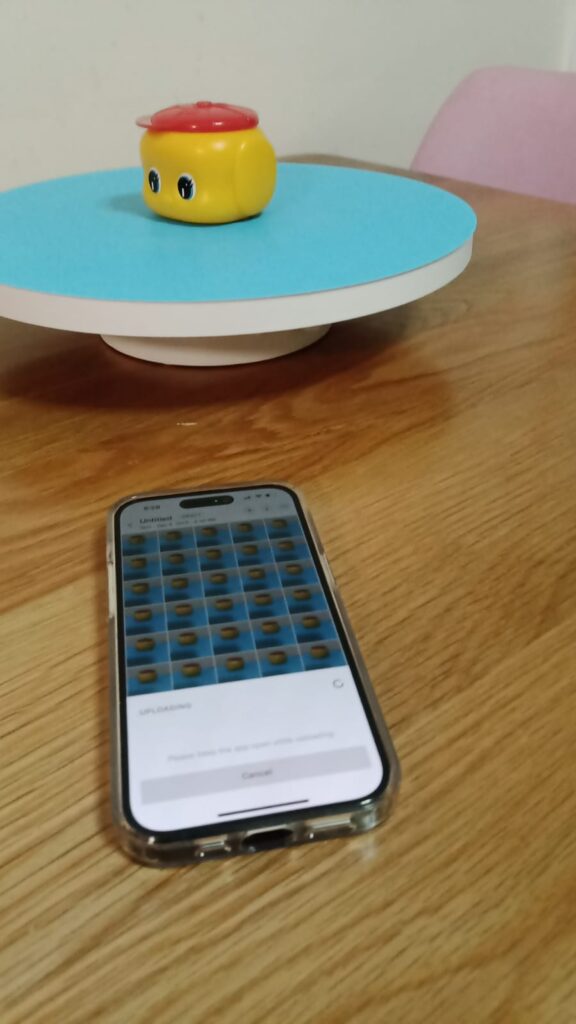 Prepare Your iPhone: Ensure your iPhone’s camera lens is clean and free from smudges or debris that could affect scan quality. It’s also a good idea to use a stable surface or tripod to minimize movement during scanning. In our example, we use a small battery powered rotation platform to rotate the object to be scanned.